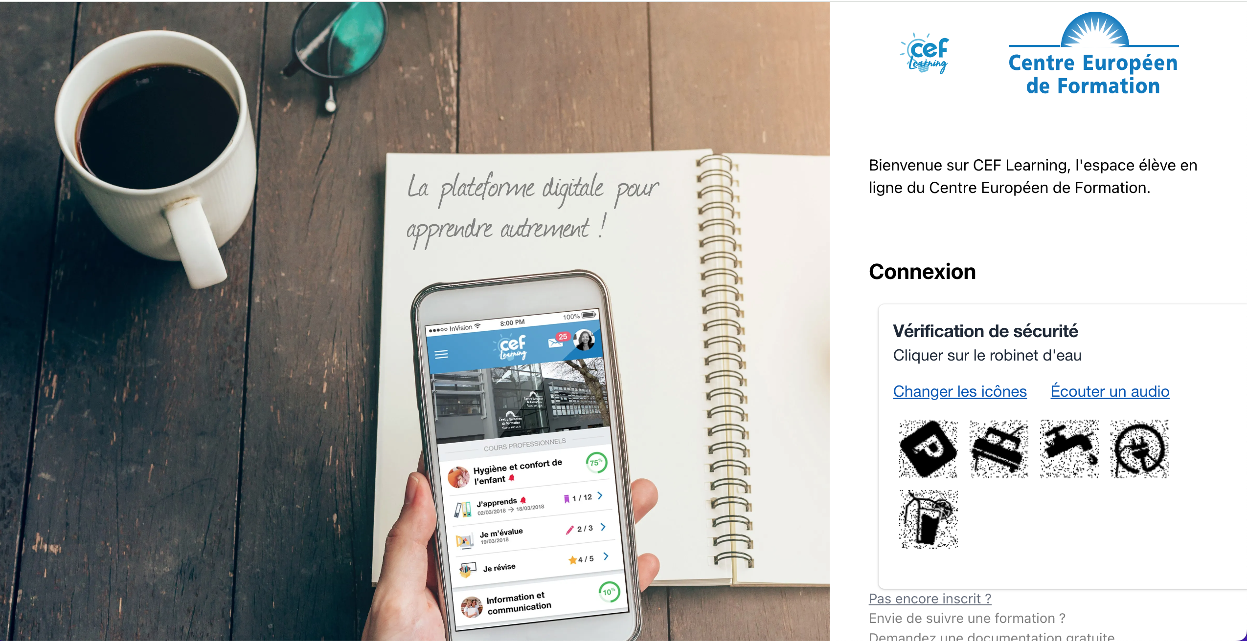 L’accès à CEF Learning est conditionné à une inscription au Centre Européen de Formation. Une fois l’inscription validée, l’élève reçoit par courrier électronique ses identifiants personnels. La connexion s’effectue depuis un ordinateur, une tablette ou un smartphone.